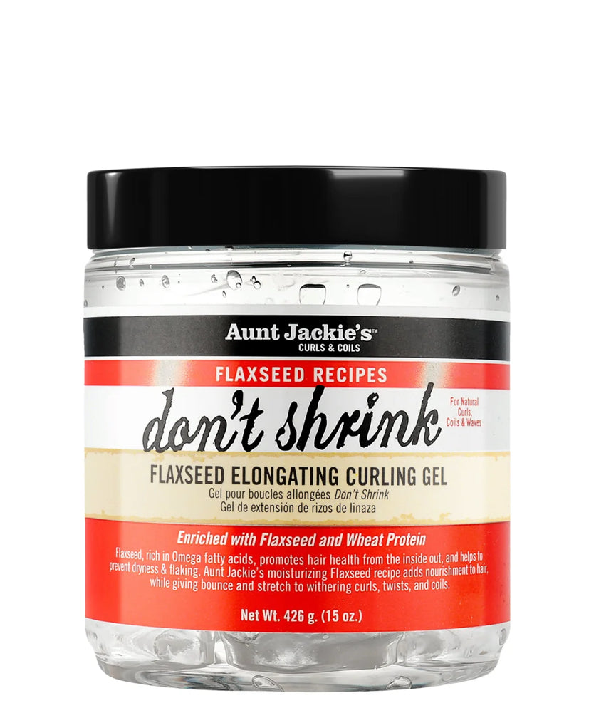 Aunt Jackie’s Curls & Coils Don’t Shrink Flaxseed Elongating Curling Gel gives beautiful stretch to shriveling curls without flaking or caking. This special blend of moisturizing conditioners, flaxseed, shea butter, and extra virgin olive oil will give dry, shriveled up curls and twists a nice, elongated stretch. With nourishing omega-3 fatty acids, flaxseed has been widely used as a natural remedy for hair growth, anti-thinning, and overall scalp health. Regular use leaves hair soft without a crunchy, tacky feel.
