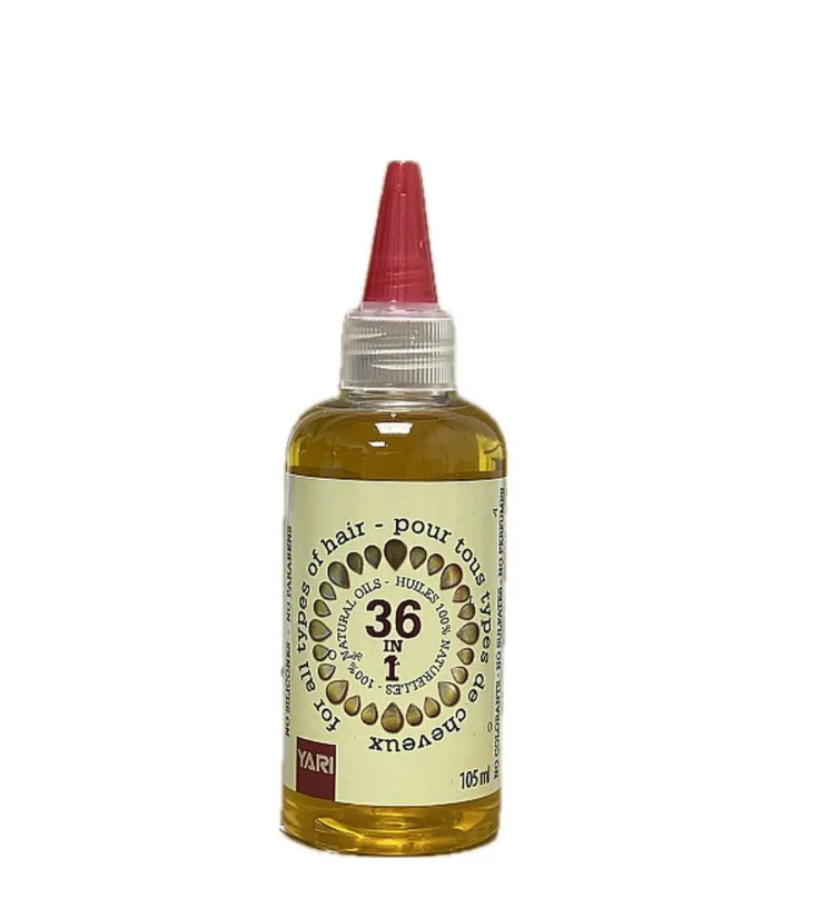 L'huile Yari 100 % naturelle 36 en 1 est une huile unique qui combine pas moins de 36 huiles différentes pour prendre soin de vos cheveux et de votre cuir chevelu. Polyvalente, elle stimule la croissance capillaire et offre de nombreux bienfaits pour vos cheveux et votre cuir chevelu. Elle prévient la chute, les fourches et la casse, tout en renforçant et en épaississant vos cheveux. De plus, elle nourrit et hydrate vos cheveux et votre cuir chevelu, contribuant ainsi à une chevelure saine et brillante.