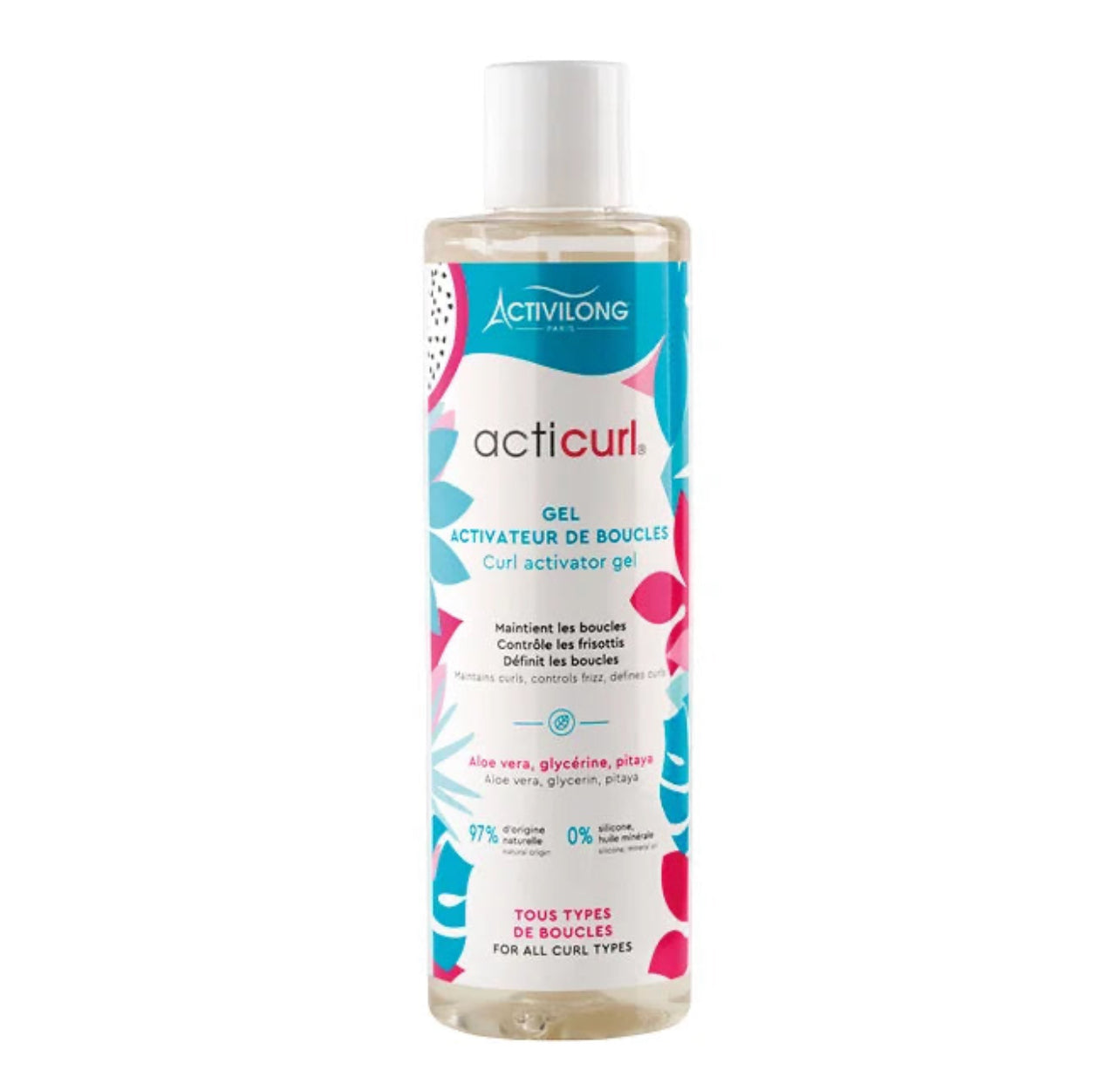 A base d'Aloe, de Pitaya et de glycérine végétale, le gel activateur de boucles ACTICURL a une texture proche de celle du gel d'Aloe.