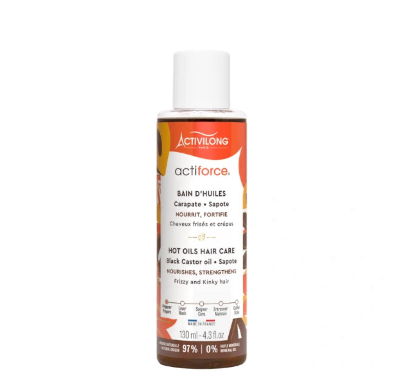 Le Bain d'Huile ACTIFORCE associe des huiles végétales pures - Olive, Ricin, Carapate, Sapote, Avocat, Sésame pour répondre aux besoins des cheveux les plus secs, ternes et cassants .