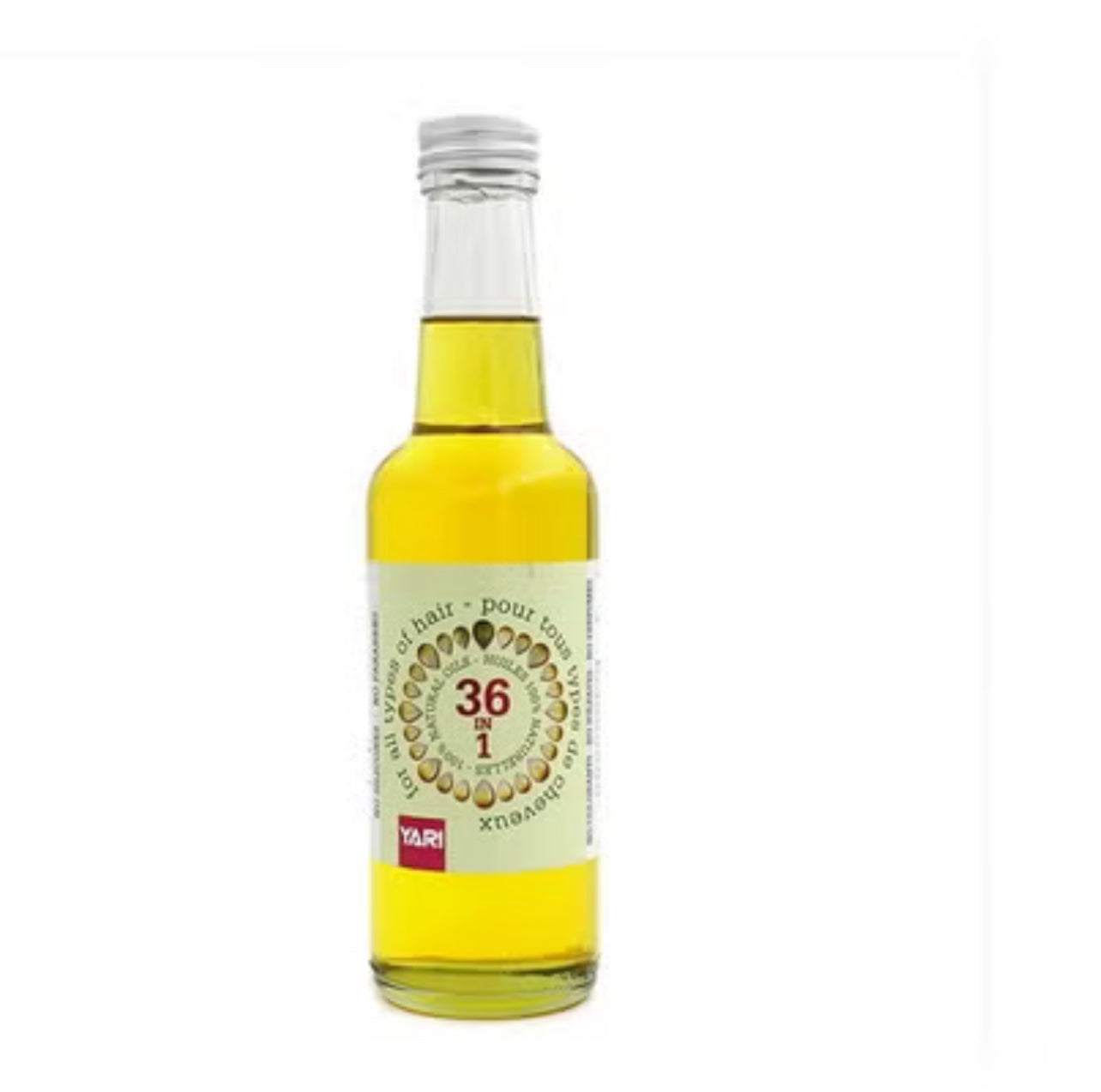 Mélange d'huiles 100 % naturelles 36 en 1 de la marque Yari. Soin capillaire naturel formulé pour tous types de cheveux.